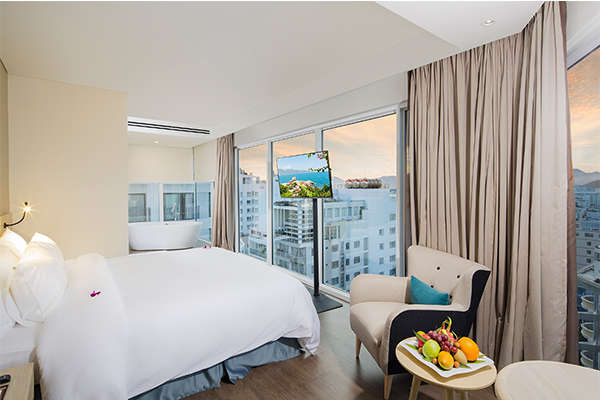 Designed with modern furnishings and contemporary décor, the Premier Ocean View rooms at our hotel aim to deliver that relaxing atmosphere for our guests to unwind and enjoy the picturesque surroundings that Nha Trang Bay has to offer. Providing a perfect balance of comfort and convenience, these rooms are ideal for both leisure and business travelers.